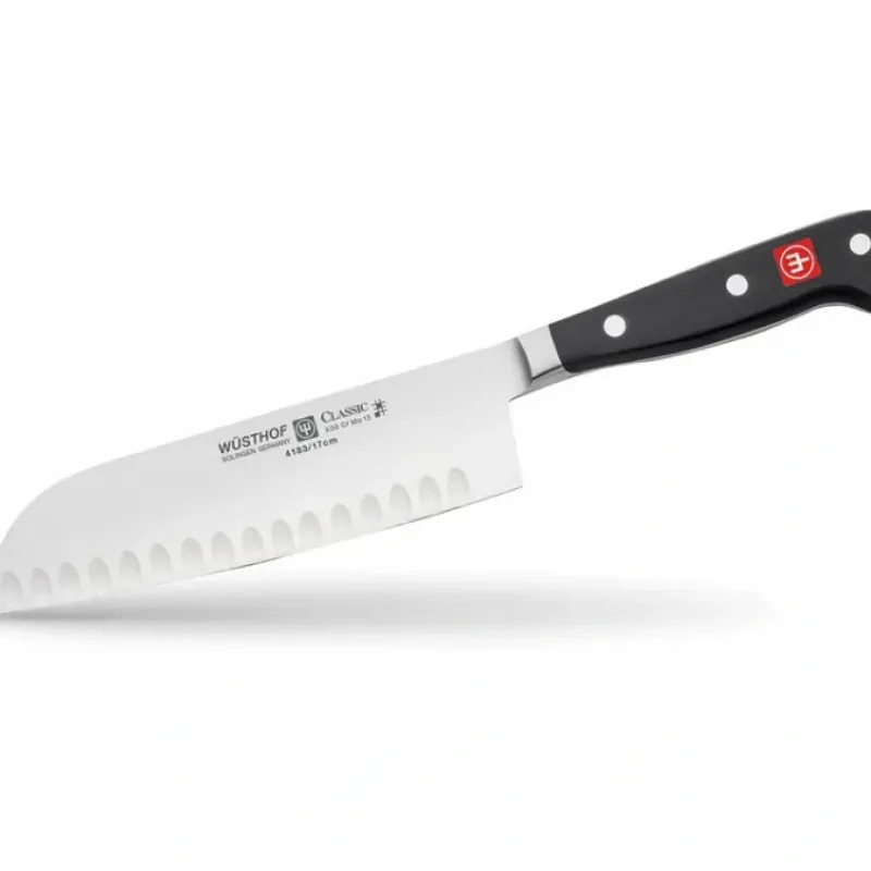 WSTHOF’S best-selling collection for generations. CLASSIC full-tang knives are precision-forged from a single piece of an exclusive high-carbon stainless steel. CLASSIC knives feature a new handle design made of a highly durable synthetic material – Polyoxymethylene (POM) – which has a tighter molecular structure to resist fading and discoloration. The CLASSIC 7″ Hollow Edge Santoku Knife is designed with a thinner blade than the traditional chef’s knife. at a 10 cutting edge. and gradually curves up at the very end providing a straighter edge. The hollow edge is crafted with evenly spaced vertical indentations. which create small air pockets between the blade and the food. These small air pockets gently push food off the blade and reduce friction and drag. This knife allows cooks to effortlessly prep a wide array of fresh produce. including starchy vegetables like potatoes. which tend to stick to a knife’s blade. Product Highlights: