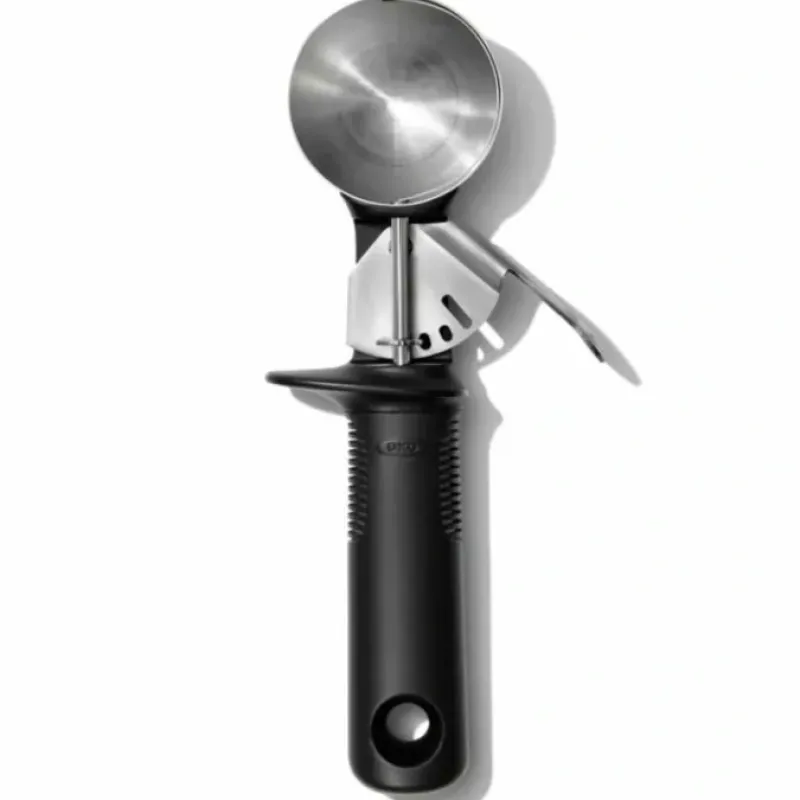 The OXO Good Grips Classic Ice Cream Scoop lets you dish up cone after cone like a soda fountain pro. It’s designed with a pop-up lever that releases scoops of ice cream. sorbet and sherbet with a simple press. The handle features a soft. non-slip grip that absorbs pressure to minimize effort even when scooping hard ice cream. Our Scoop is constructed with durable stainless steel that won’t chip. pit or rust. and it’s dishwasher safe.