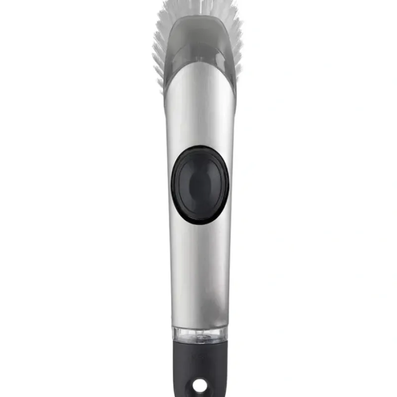 Oxo’s Soap Squirting Dish Brush combines a long-handled brush with liquid dish soap for convenient cleaning. The soft button doubles as a seal; just pull open the seal and fill the clear body with soap. Reseal the opening. and you’re ready to dispense soap with the press of a button! The soft grip is comfortable to hold and is non-slip. even when wet. Durable nylon bristles easily scrub away baked-on food and are safe for non-stick cookware. When it’s time for a new brush head. simply push up on the tab to replace it. Replacement brush. scrub or sponge heads sold separately here. Dishwasher safe
