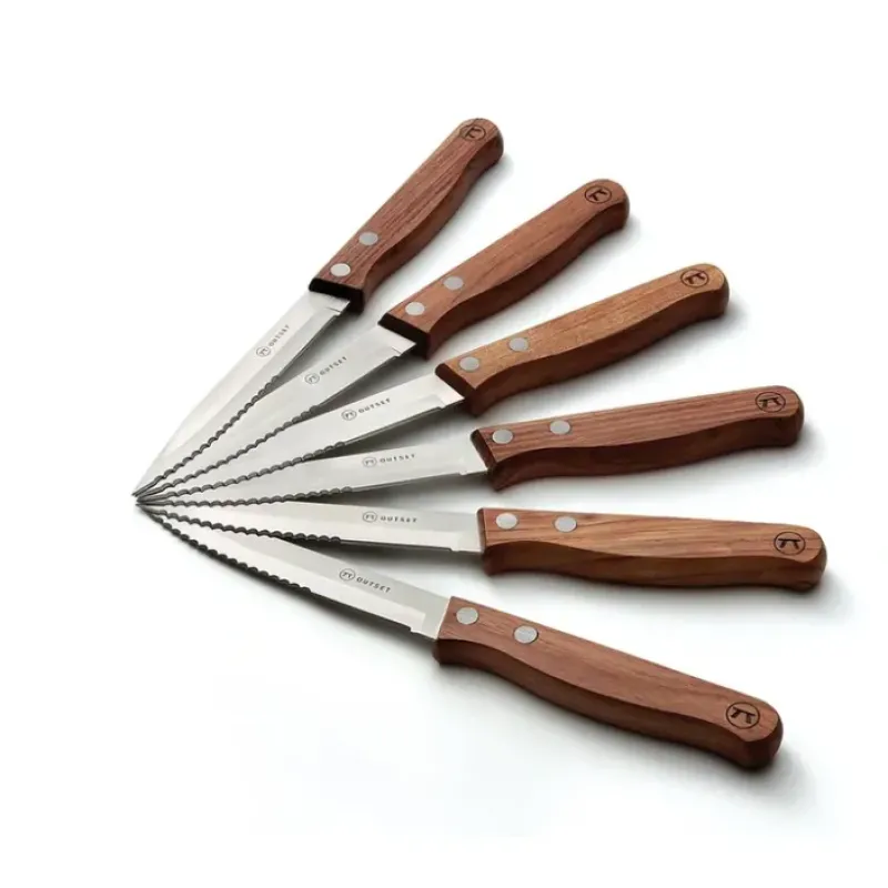 The accustomed griller will be primed to enjoy their grilled feast with these traditional and dependable steak knives. The classic. serrated edge blades are constructed of sturdy stainless steel. and the fine. solid rosewood handles provide a comfortable grip. Apart of an extended family of tools. these classic steak knives are down to earth and project attractive aesthetic features