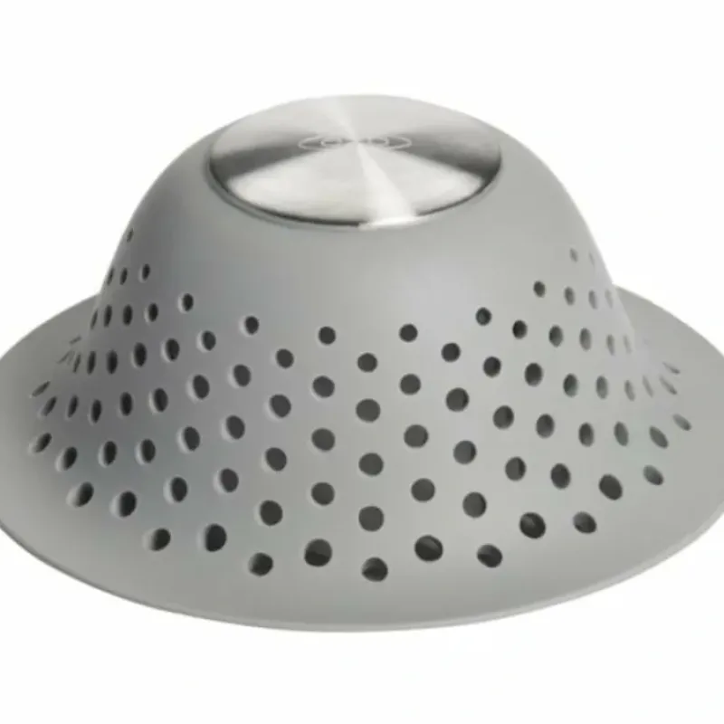 The Drain Protector catches hair without blocking water drainage. and the tall dome shape accommodates both flat and pop-up drains. The silicone Drain Protector has a stainless steel weighted accent to keep it in place. and the edges sit flush with the tub so no hair gets through.