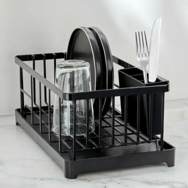 This simple drainer rack fits in next to any sink and is self draining. It can hold any variety of plates. bowls. dishes. utensils or glasses that need drying there is a small tube on the bottom that drains all excess water right into the sink.