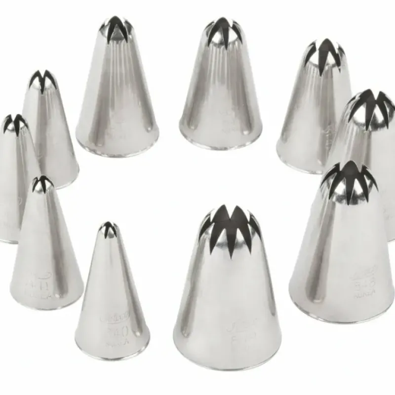Create deeply-grooved icing patterns on your cakes. cupcakes. pies. and more with this Ateco 850 10-piece closed star pastry tube decorating set. Made of durable stainless steel. each tube is rust-resistant and designed to withstand repeated use without bending out of shape. Featuring one tube of each size. #0 through #9. ranging in width from 5/32″ to 11/16″. this set gives you versatile usage and size variation in your icing decorating. You can create shells. stars. fleur-de-lis. rosettes. and flowers. The closed star design produces a defined texture for eye-catching bakery decorations. Using the right sized pastry tube for the job will enhance your presentation to draw patrons’ attention to your display cases and plated desserts.