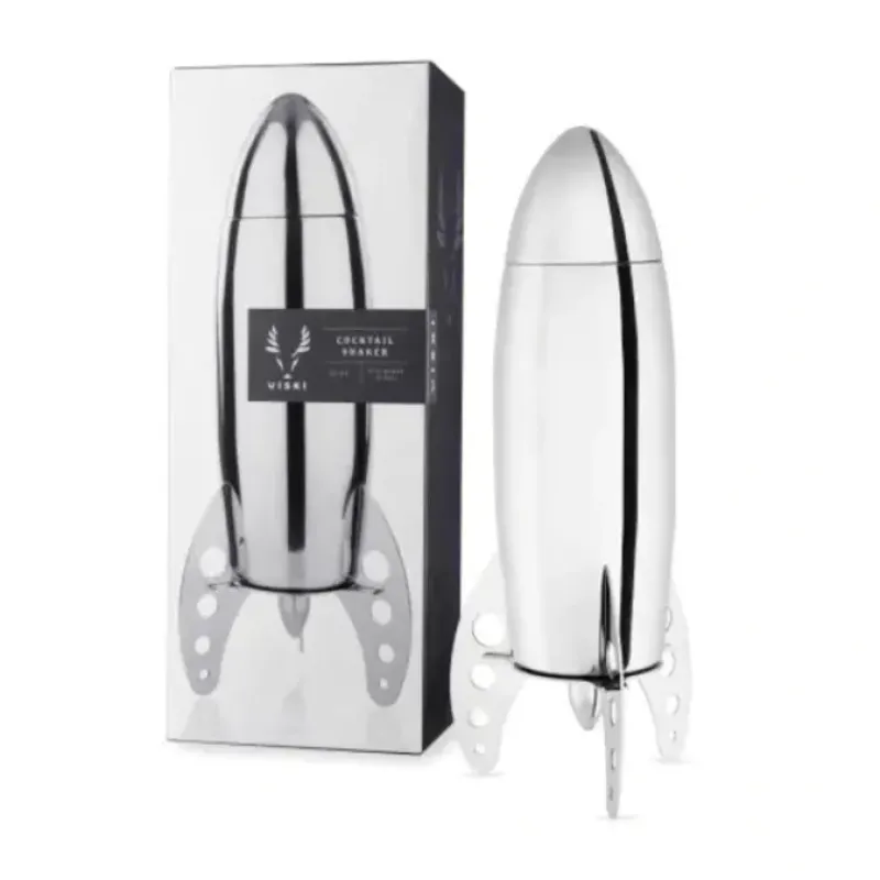 Sleek and space-worthy. our retro stainless steel rocket cocktail shaker holds 24 ounces incorporating a strainer. lid. capsule-esque cap. aerodynamic body and launch-ready shaker stand. Hand wash recommended.