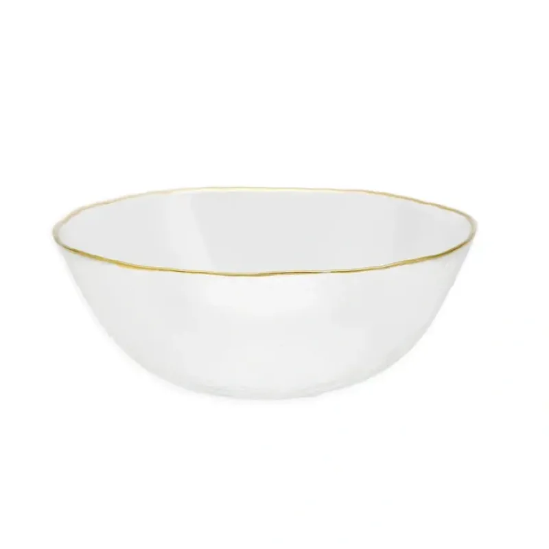 This salad bowl was constructed out of fine glass material and decorated with a bold gold trim. Its beautiful shape. size. and design makes it ideal for every occasion. Whether you choose to display it by itself or to combined it with its expanded collection. this bowl will truly enhance your table setting.Dimensions: 11″DHeight 5Material/Finish GlassColor GoldDiameter 11