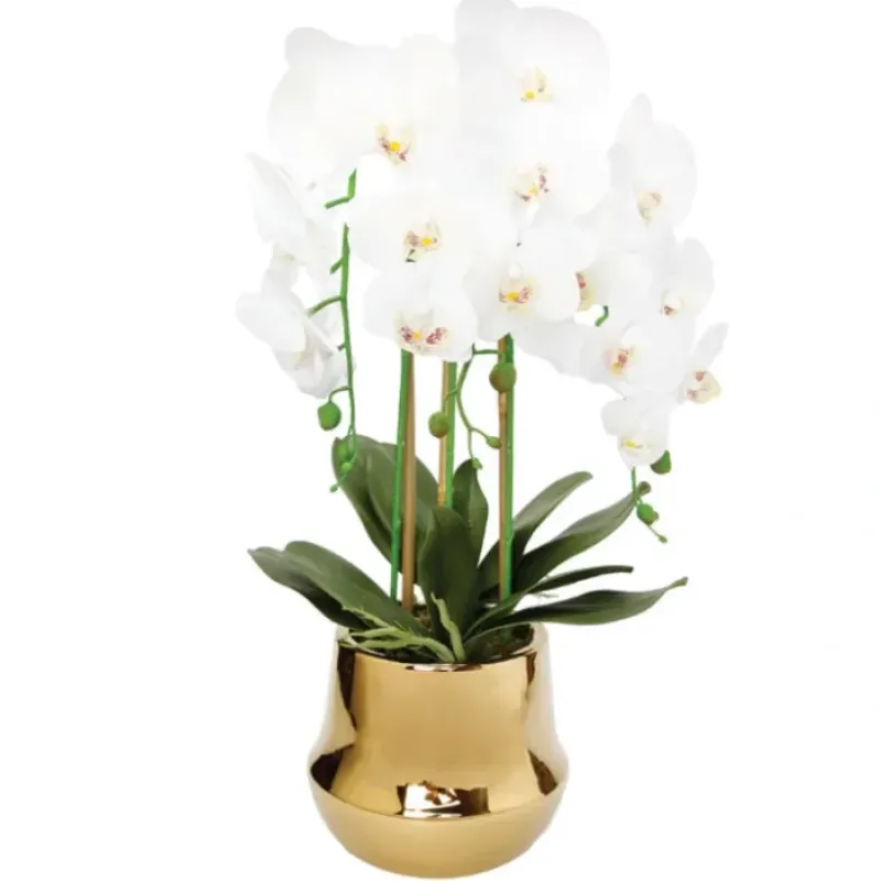 DescriptionN6637467OP2722 White Orchid plant in Round shiny gold vase