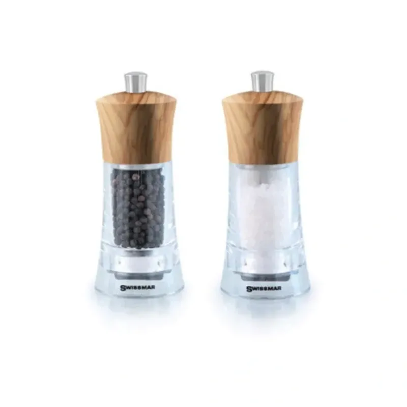 Beautifully designed acrylic mills with genuine olive wood tops add elegance and style to any table topHigh grade stainless steel shaft for superior performanceCeramic grinder – harder than steel. odourless. rust and corrosion-proofFully adjustable grind settings for custom and consistent output (coarse to fine with a simple turn of the knob)Swissmar mill sets do not include salt and pepper