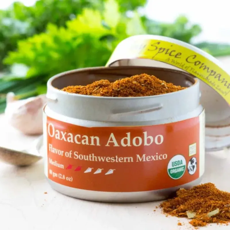 Oaxacan Adobo is a traditional chili based Mexican seasoning. fantastic as a dry spice rub or as a general spice blend. It truly shines when combined with a bit of citrus juice or vinegar to make a marinade. The flavor is a round and deep earthiness with moderate chili heat and fruitiness that will bring diners back for more.