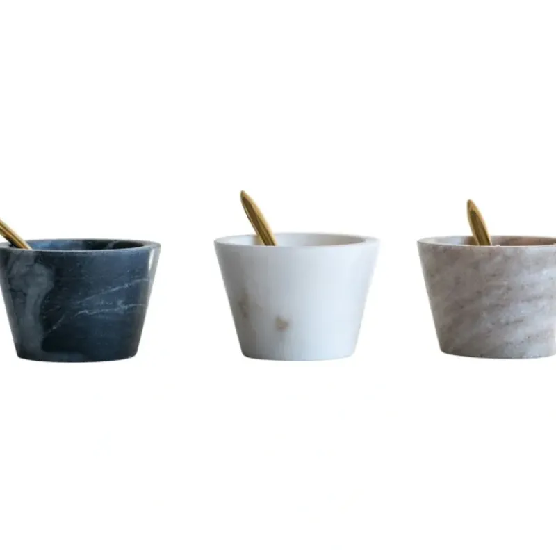 Catalog Name: 3″ Round x 2″H Marble Bowl w/ Brass Spoon. Set of 2. 3 Colors