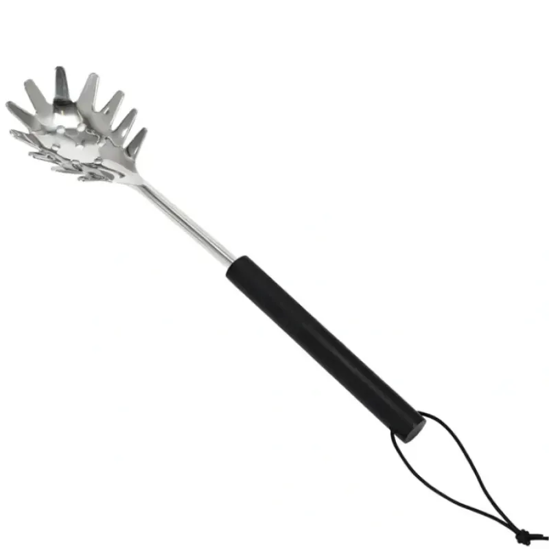 This elegant pasta server features sleek stainless steel construction finished with a black mango wood handle and leather tie.