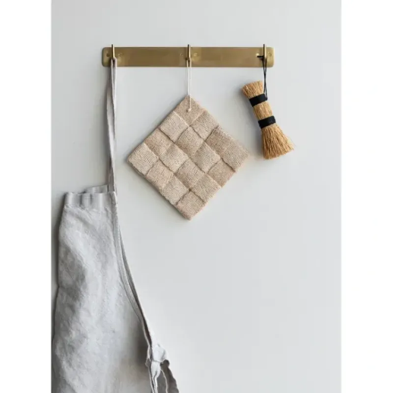 The handmade Brass Iron Plate Triple Hookby Fog Linen Work is perfect for heavy items such as jackets. as it can be mounted with six screws that are included. However. it works equally well in the kitchen for tea towels or other small items.