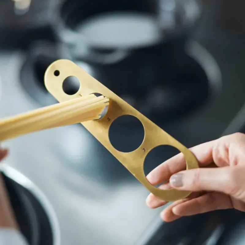 This beautiful Brass Pasta Measure has four different measuring holes to identify the correct amount of spaghetti for 1-4 servings.