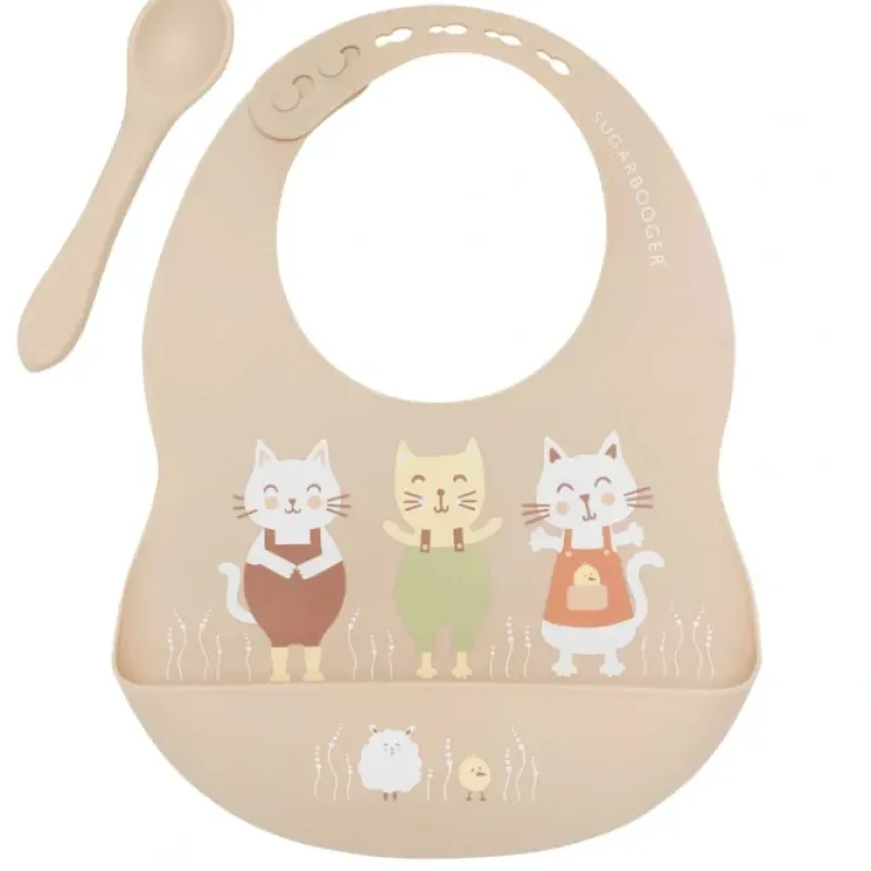 - Our silicone bibs and spoons are easy to wipe clean * Bib includes 6 adjustment holes * Adorable graphics makes it fun to take pictures of those first bites * Bonus: Fun graphics coordinate with the matching plate. bowl. and silverware * Safe: non-toxic. lead-free. phthalate-free. PVC-free Silicone