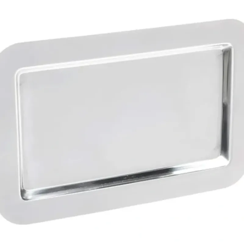 18/10 Stainless steel individual serving tray.Polished mirror finish.Can be used as an individual tray or used with Frieling sugar and creamers: Item #0105. #0106 and #108.Outside measures 9.4″ x 5.6″ inside measures 7.3″ x 3.5″