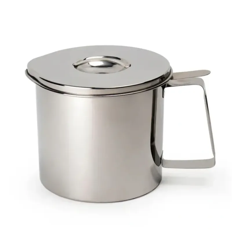 - Made of durable stainless steel this container features a pour spout. lid and a fine mesh strainer perfect for separating the bacon bits from the fat.
