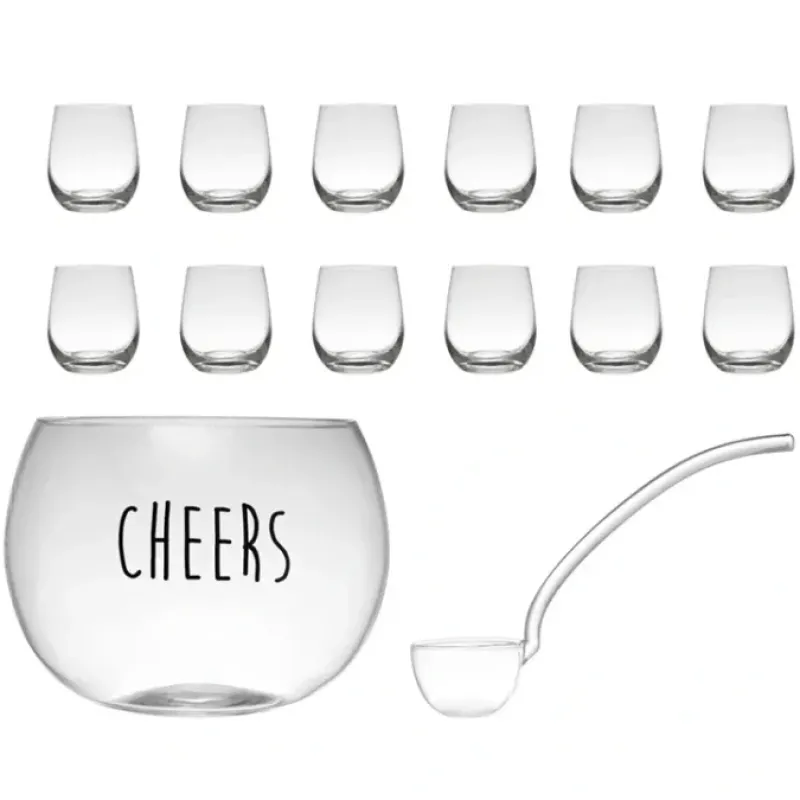 13″ Round x 8-1/4″H 6-1/2 Quart Glass Punch Bowl “Cheers” w/ Ladle (12) 8 oz. Glasses. Set of 14