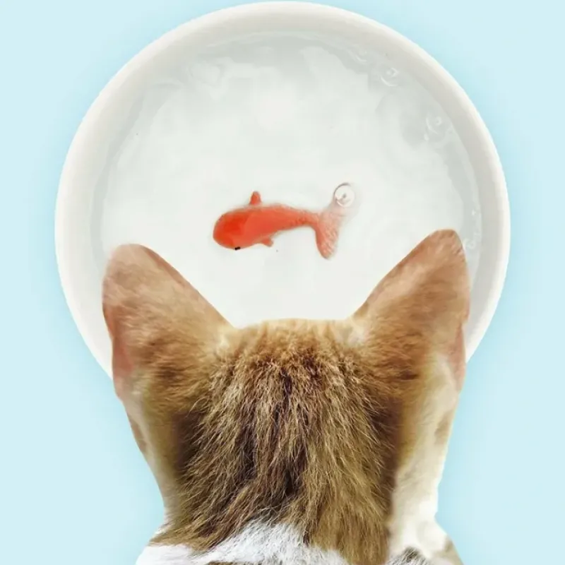 - Small White ceramic pet bowl with 3D Goldfish design at the bottom