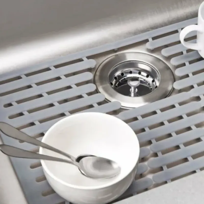 Designed to let air and water flow freely. If you want to have an opening around your drain. the Silicone Sink Mat has a convenient pattern that allows you to cut a hole exactly where you need it. whether your drain is in the center or the back of your sink. Also available in a larger size.