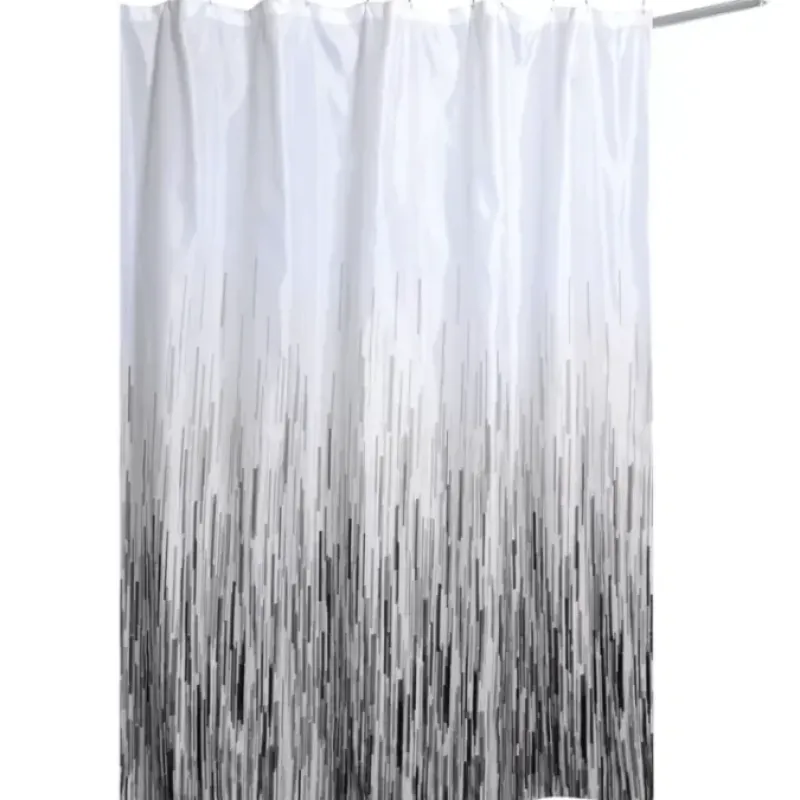 The Greyscale Rain Shower Curtain by Moda. is printed in beautiful grey tones on a solid white polyester for a relaxing look. This Shower Curtain features an abstract pattern. almost feels like a warm summer rainfall. This fabric shower curtain will go easily with any décor and brighten up your shower space. Made of 100% Polyester. Easy Care. Machine Washable. A shower liner is recommended.