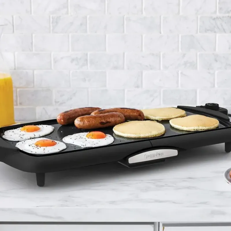 Cook enough pancakes. bacon. grilled cheese sandwiches or fajitas for a crowd with this large countertop electric griddle. Ideal for brunches. big family dinners and casual gatherings. the griddle provides plenty of cooking space. precise temperature control and a non-stick ceramic coating. Excess fats and other liquids drain into the removable drip tray.