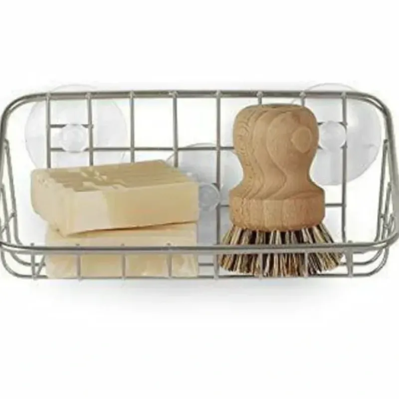 Keep your kitchen sink organized and clutter free with Spectrums Grid Suction Sink Organizer. Perfect for holding sponges. scrub brushes and other kitchen accessories. the open design allows items to thoroughly dry to help eliminate the growth of bacteria. Three suction cups firmly adhere to most smooth surfaces ensuring the unit stays in place. Made of stainless steel. this organizer can also be applied to shower walls or glass doors in the bathroom.