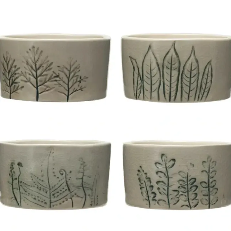 3-3/4″ Round x 2-1/4″H Hand-Painted Stoneware Bowl w/ Botanicals. Reactive Crackle Glaze. Cream Color Green. 4 AssortedStyles (Each One Will Vary)