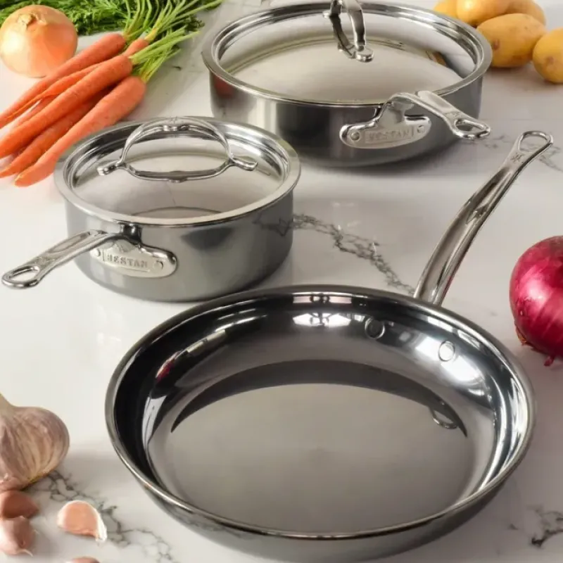 Each piece in the Hestan NanoBond Stainless Steel5 Piece Cookware Set incorporates NanoBond technology. a combination of titanium alloys and stainless steel making an extremely scratch-resistant and durable surface that’s also a wonderful conductor of heat. Flush rivets inside and out allow easy cleaning and neatly stacked storage. These pots and pans are four times more durable than traditional stainless steel. 35% more conductive. and are resistant to scratches. staining and salt pitting. The NanoBond series will retain its good looks dish after dish. year after year.