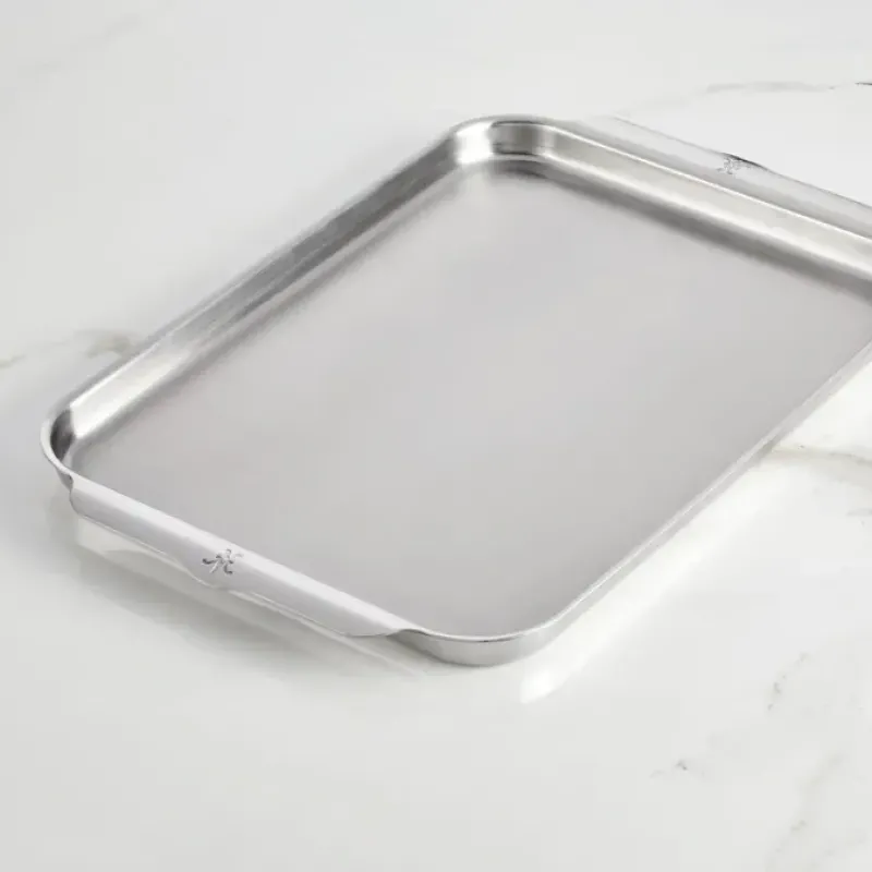 Warp-resistant cladroasting sheet pan features wide curved handles. providing an easily accessible. firm hold when removing from the oven. even when wearing oven mitts. Brushed stainless steel interiors and polished exteriors givethis pan a lasting aesthetic that keeps it looking newer and longer. This gourmetsheet pan is broiler safe and oven safe to 600°F to accommodate a wide range of recipes.