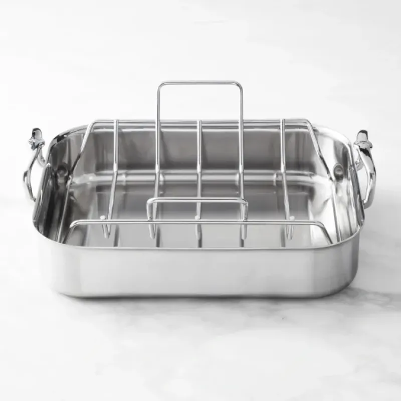 Hestan takes its reputation for exceptional craftsmanship and innovation to a whole new level with Provisions. essential tools for everyday cooking or holiday entertaining. Constructed of durable 3-ply stainless steel with an aluminum clad core. this roaster is ideal for baking. roasting and searing. Its outstanding heat conductivity and wide surface area make it a go-to pan for sauce-based reductions and gravy on the stovetop. It includes a stainless-steel V-shaped rack that elevates meats and poultry to enhance heat convection for fast. even cooking.