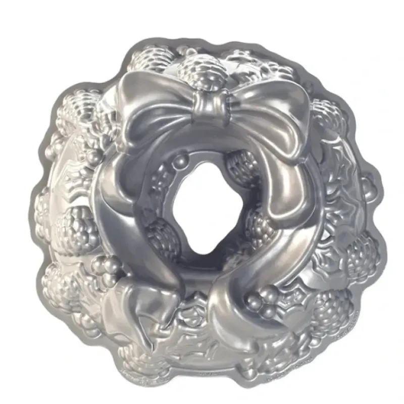 Create a beautiful centerpiece or holiday treat for your next festive gathering. The Holiday Wreath Bundt pan creates a wreath cake sculpted with pine cones. holly leaves. berries and ribbon.