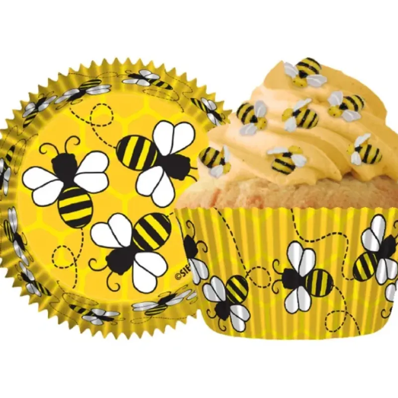 This delightful cupcake liner features busy honey bees on a cheerful yellow background.