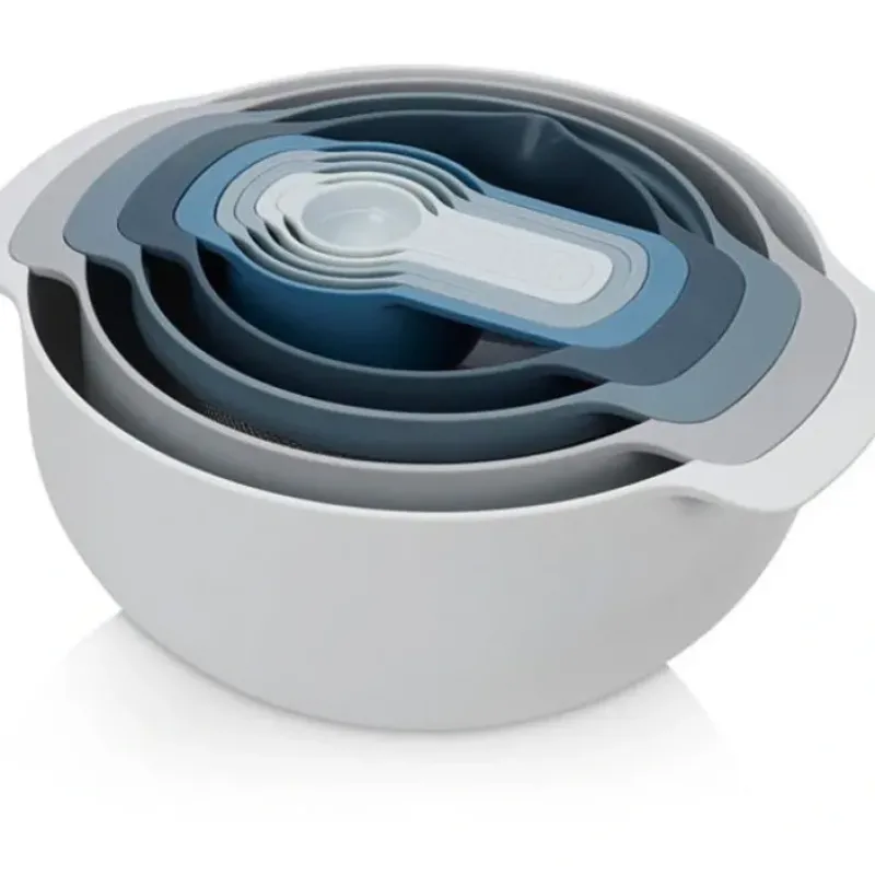 - Set includes: 4.5L mixing bowl. 3L colander. 1.65L sieve. 0.5L mixing bowl 5 measuring cups