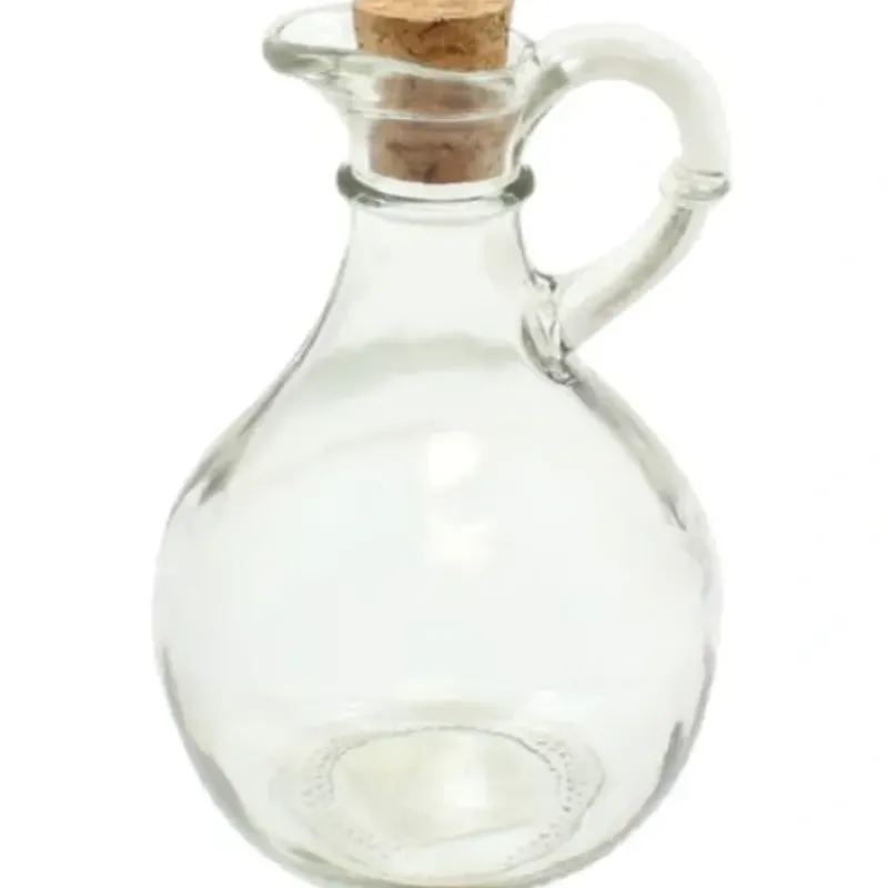 Introducing the Olive Oil Bottle. a must-have for every kitchen. This 10 oz. clear glass bottle with a convenient handle allows for easy pouring and storage. Its durable design ensures it is dishwasher safe. making it perfect for everyday use. The cork stopper keeps your olive oil fresh and flavorful. Please note. it must be hand washed to maintain its quality. This professional-grade olive oil bottle is a perfect addition to any restaurant or home kitchen.