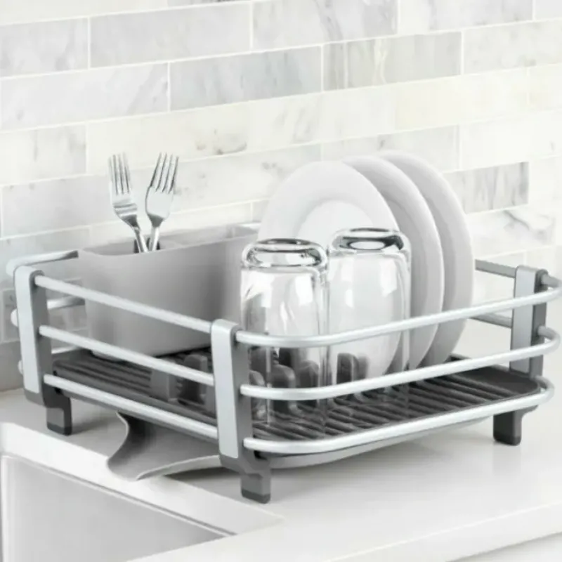 The OXO Good Grips Aluminum Frame Dish Rack combines the versatility of an open-design platform with the durability of an aluminum frame. The adjustable drain board and removable utensil cup let you take control of your countertop. And with the unique plate racks. open center. and sturdy frame. this Rack can hold everything from your breakfast dishes to the aftermath of Thanksgiving dinner.