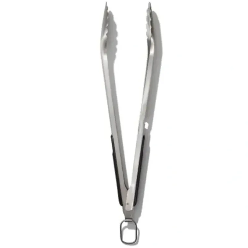 With heavy-duty stainless steel construction and a smart. scalloped head design. the OXO Good Grips Grilling Tongs with Built-In Bottle Opener are sure to be your grilling go-tos. Angled heads grab and hold onto everything from thick cuts of meat to corn on the cob for fumble-free flipping. turning. and transferring. The handle has a built-in bottle opener for ultimate convenience and an extra-long design to keep hands safely away from heat. Pull the ring to lock the Tongs closed and hang right by the grill for storage. Dishwasher safe.