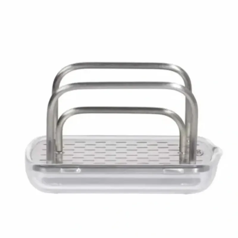 The Stainless Steel Sponge Holder keeps two sponges or scrubs at the ready for washing dishes. Compact design allows it to fit neatly next to the sink without taking up much space. The drip tray is removable for easy cleaning. Open sides and ventilation holes allow for maximum aeration. and the pour spout allows for draining soapy water.