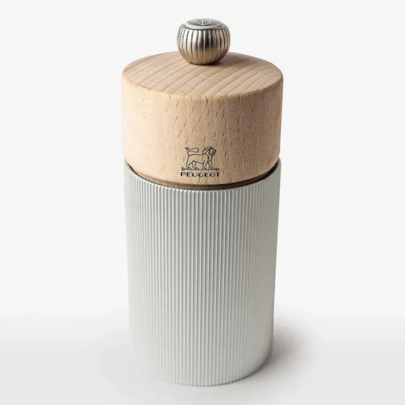 Legendary millmaker Peugeot houses its ultra-reliable grinding mechanism in an impeccably built salt mill with linear beauty. Topped with a natural beechwood cylinder. the striated aluminum body provides a sturdy grip and plays with the light for an eye-catching. graphic effect. The ribbed aluminum knob on top adjusts the grind to your preferred coarseness or fineness. Fitting comfortably in the hand. this modern salt mill grinds grey. pink. smoked and other delicious rock salts.