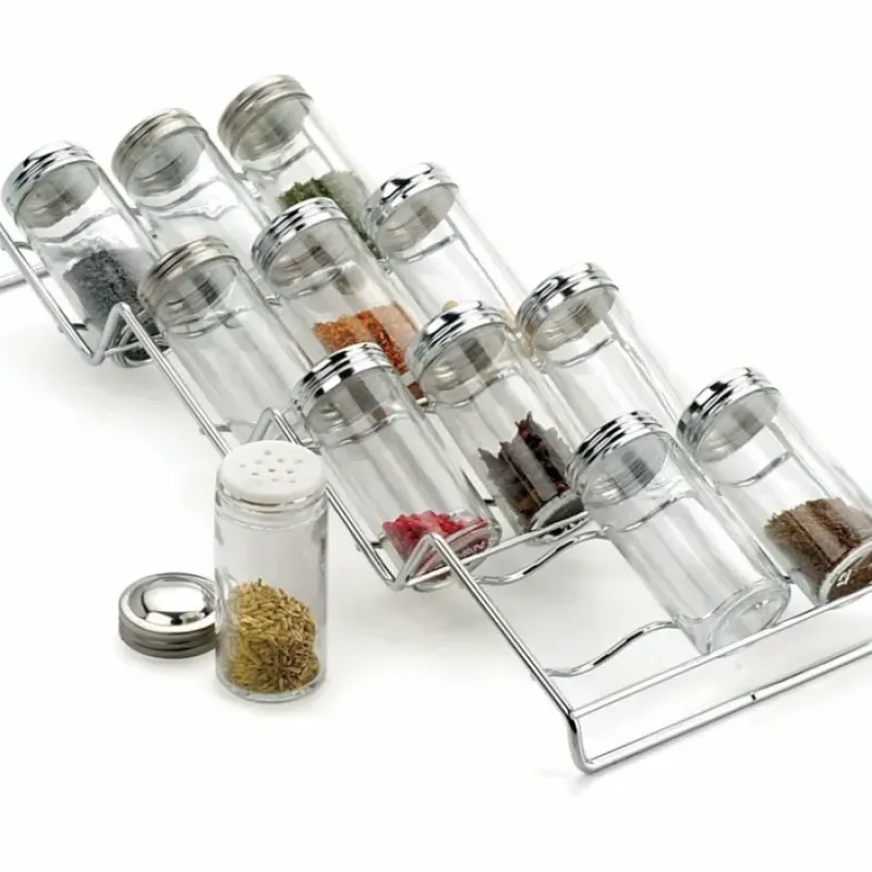 - Stainless steel spice rack includes – 12 clear glass spice bottles with plastic shaker inserts