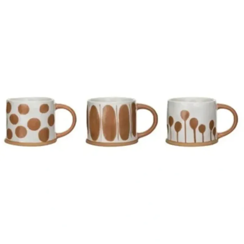 4-1/4″ Round x 3-1/4″H 16 oz. Stoneware Mug w/ Pattern. Tan Cream Color. 3 assorted Styles.