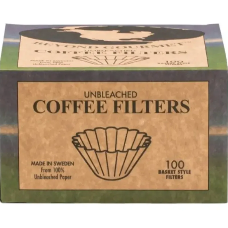 - Beyond Gourmet’s Unbleached Basket Coffee Filters for making coffee in 8 to 12-cup capacity automatic drip coffee makers