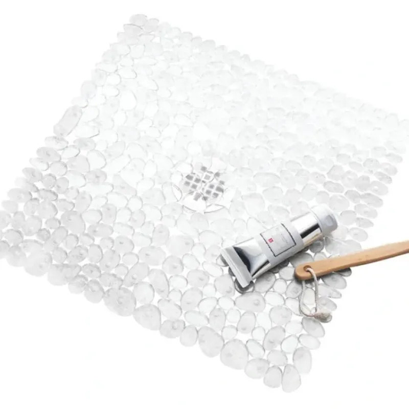 This translucent. flexible shower mat gives the look of smooth and textured pebbles beneath your feet. giving your bathtub a look that hearkens back to nature and looks even better in the water. Adorning the bottom of the mat are numerous suction cups that stick to your bathtub to ensure a slip-free wash. Soft. pliable plastic construction cuts easily with scissors or a blade to provide an exact fit.