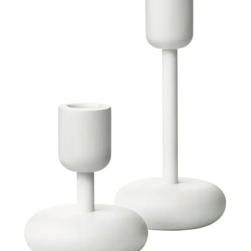 The long and the short of a lovely modern table setting. The Iittala Nappula Set of 2 Candleholders includes one tall and one short powder coated steel candleholder. They are graphic. modern pieces. each with a wide. rounded base evocative of a button (or “nappula.” in Finnish). Designed by Matti Klenell.