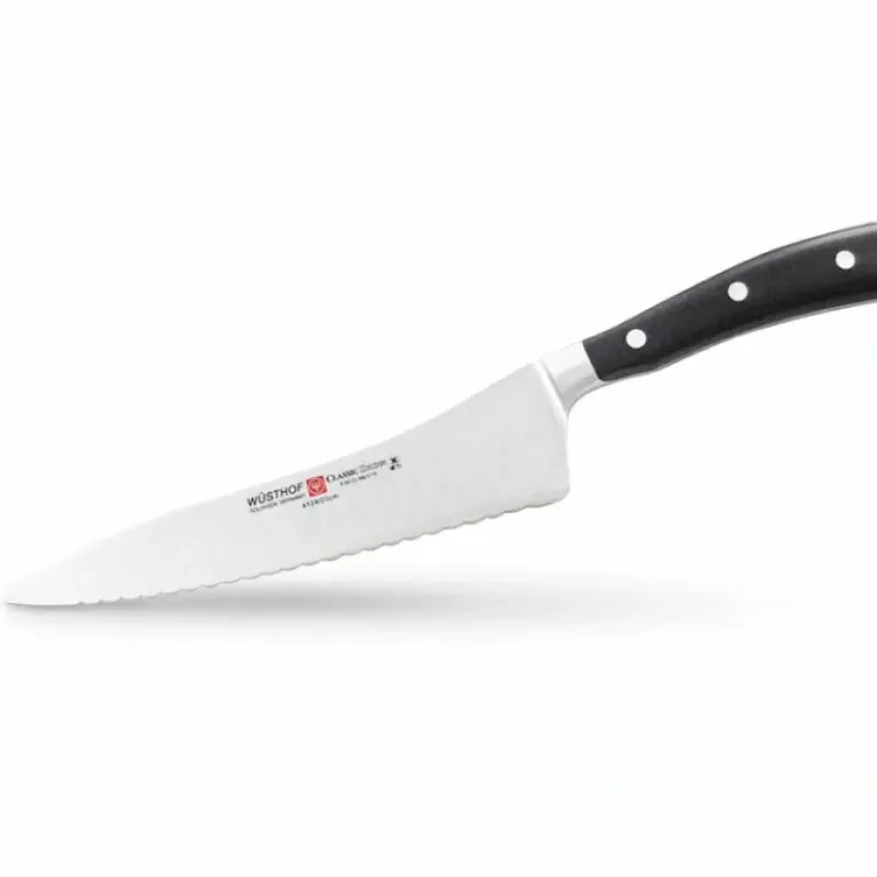 Designed for slicing panini. this specialized German knife is equipped with a scalloped high-carbon-steel blade that cuts easily through crisp golden crusts without squashing the sandwich’s contents. The contoured handle is offset. providing additional clearance for knuckles while slicing.
