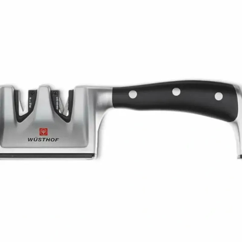 Keep your Wüsthof cutlery in prime condition with this easy-to-use handheld sharpener. Perfect for sharpening and honing all types of knives. it produces a cutting angle of approximately 14 degrees per side. Use the Coarse slot for dull blades. then hone to razor-sharpness with the Fine slot. To refresh an already sharp edge. just run the blade through the Fine slot.