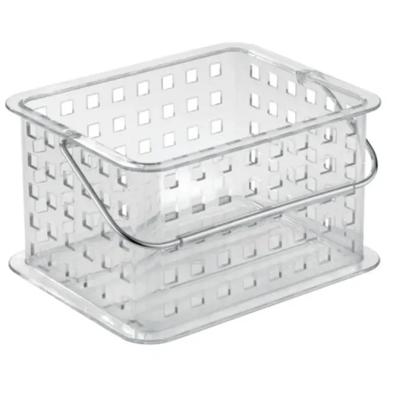 Simple convenient storage for anywhere in your home the InterDesign clear plastic basket with chrome handles will be a welcome addition. Perfect for the bathroom kitchen laundry room or playroom the storage options are endless.