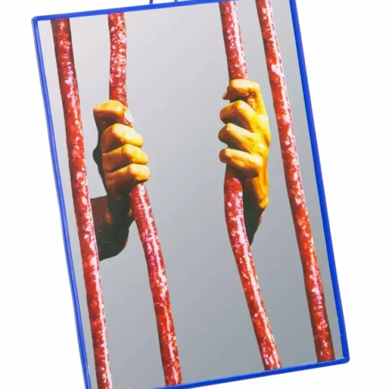 This beautiful Seletti Wears Toiletpaper Jail Mirror is part of the original collaboration between contemporary Italian artists Maurizio Cattelan and Pierpaolo Ferrari did with home decor Italian brand Seletti. This mirror humorously reflects you while at the same time displaying a pair of hands behind a sausage jail so as to wittingly suggest. it is you the one behind bars. This Seletti Wears Toiletpaper Jail Mirror is designed to be hung or to stand on the table of your preference. More details on Seletti Wears Toiletpaper Jail Mirror: