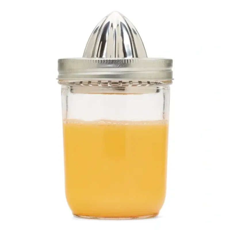 Transform your jars into your new favorite citrus juicer! Our metal Juicer lid is made from sturdy and long-lasting 18/8 stainless steel. specially designed to bring even more uses to your wide mouth mason jars. Please note. this item does not include any mason jar components (Jar. Lid. or Ring). We recommend using an 8 or 16 oz. jar for best use. To use. apply some force to snap lid into rim. The reamer on top is great for lemons. limes and small oranges. and the featured screen will filter out pulp and seeds. leaving you with freshly squeezed juice in the jar! Snap. squeeze. chug! There’s nothing fresher. Because. let’s be honest. everything’s better in a mason jar