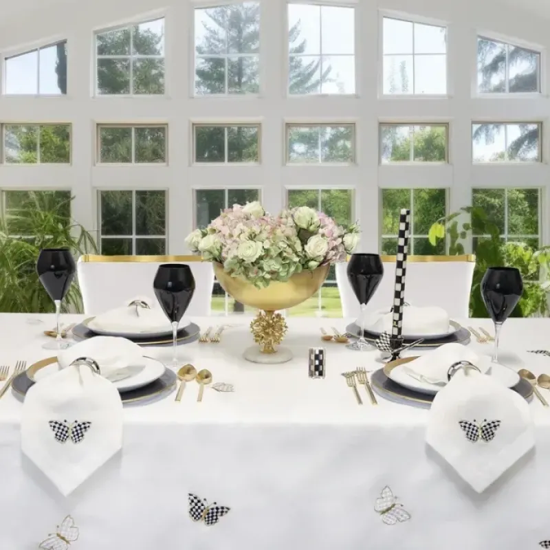 Introducing the Kenzie Tablecloth. inspired by the luxurious and exclusive aesthetic of macKenzie childs. Elevate your dining experience with this sophisticated and elegant tablecloth. evoking the world of art and fashion. Adorn your table with this tasteful and unique piece. perfect for any occasion.