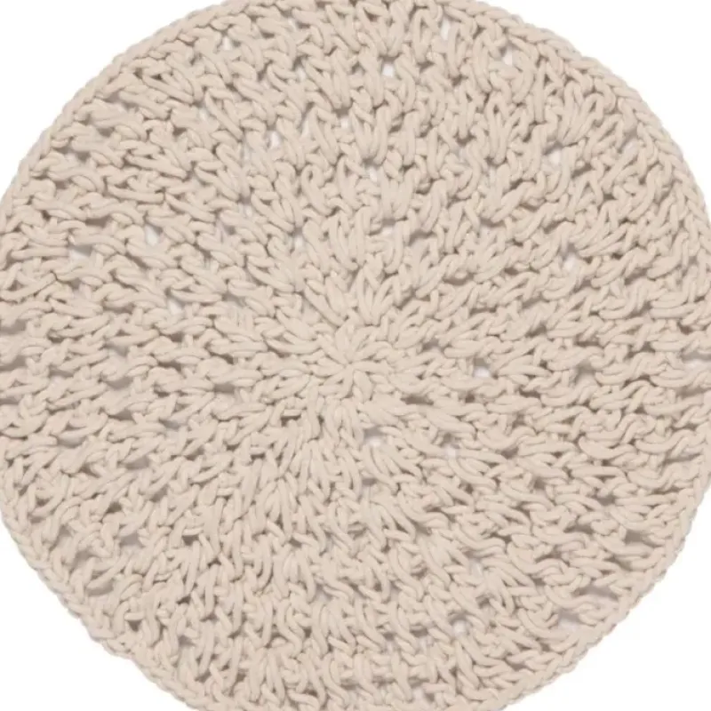 15″ round. thick handwoven placemat in a natural color. made of 100% cotton. Alternatively. it can also be used as a trivet for large pots and pans. Machine wash cold. dry low. Made in India.