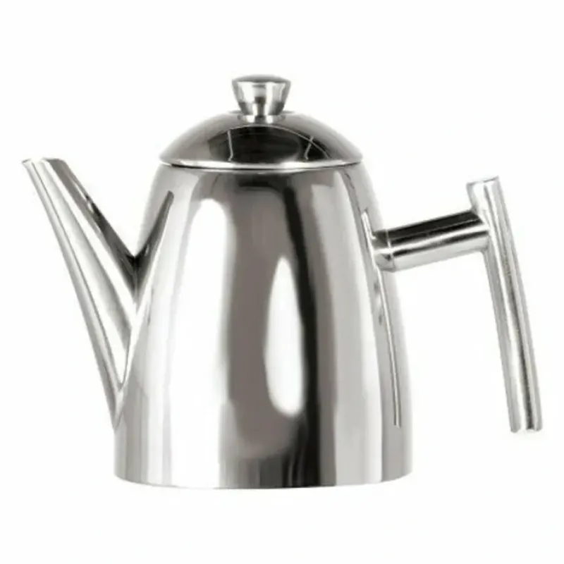 Frieling Primo Teapot w/Infuser. mirror finish. 34 fl. oz. Includes micro-etched tea infuser with handle. The built-in tea leaf guard holds back even the smallest tea particles. 18/10 stainless steel.